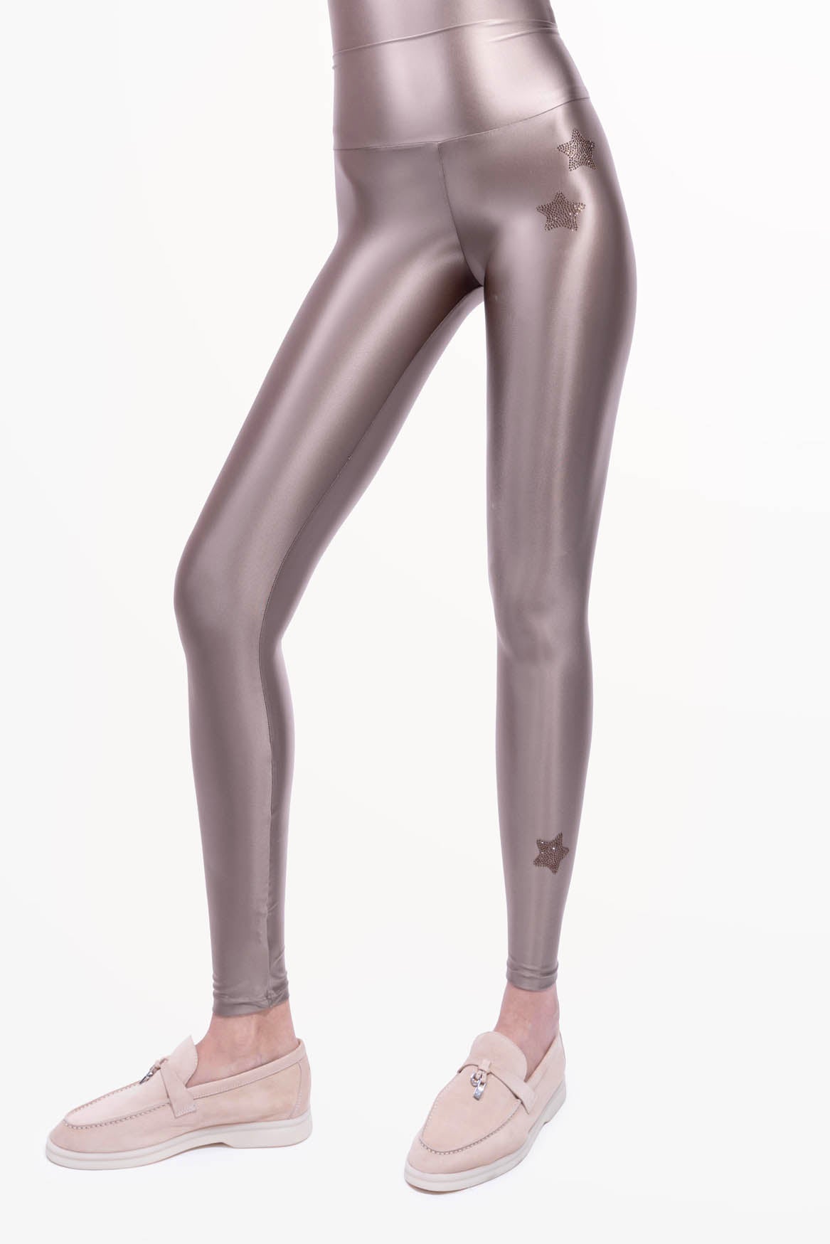 Preziosi leggings in lycra effetto seta, baschina in vita dettaglio con stelle argento realizzate con splendidi cristalli.