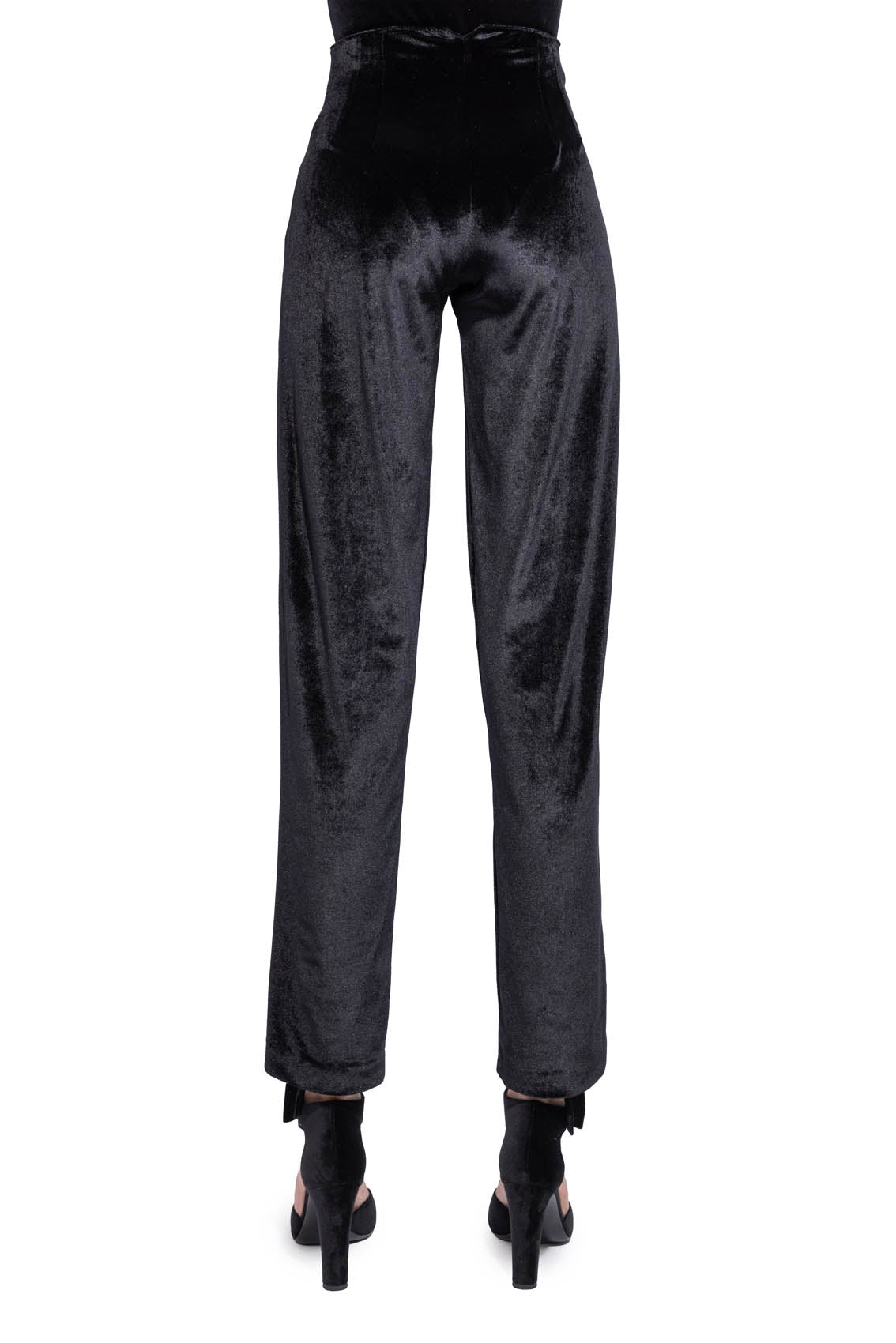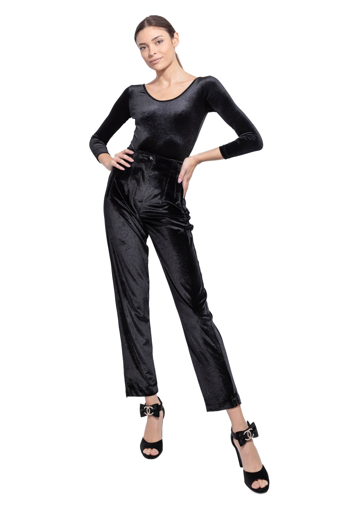 Realizzato in un tessuto velluto elastico ma strutturato, questo pantalone presenta una vita alta scolpita con pieghe frontali delicate e chiusura invisibile rifinita dalla nostra iconica stella applicata. La gamba è morbida, leggermente affusolata, perfetta da abbinare sia a una camicia in seta che a un top più audace.