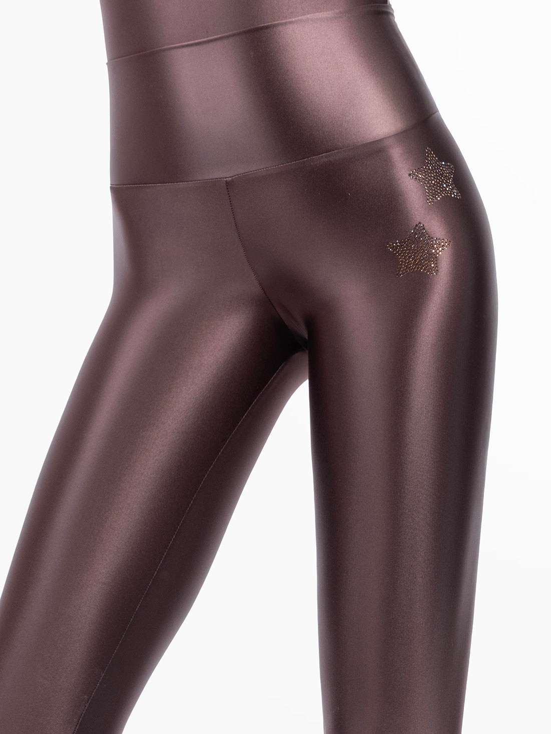 Edle Lycra-Leggings mit Seideneffekt, Chocolate Farbe, Schößchendetail an der Taille mit silbernen Sternen aus prächtigen Kristallen.