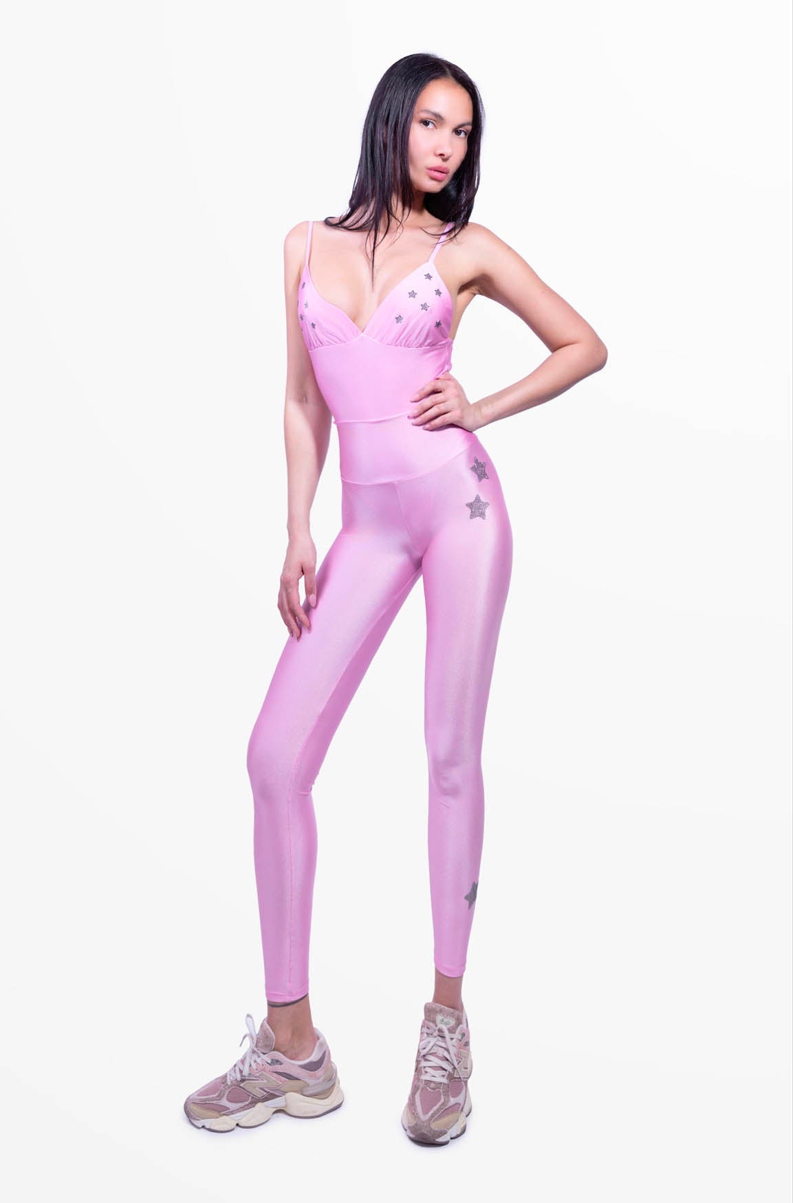 Edle Lycra-Leggings mit Seideneffekt, rosa Farbe, Schößchendetail an der Taille mit silbernen Sternen aus prächtigen Kristallen.