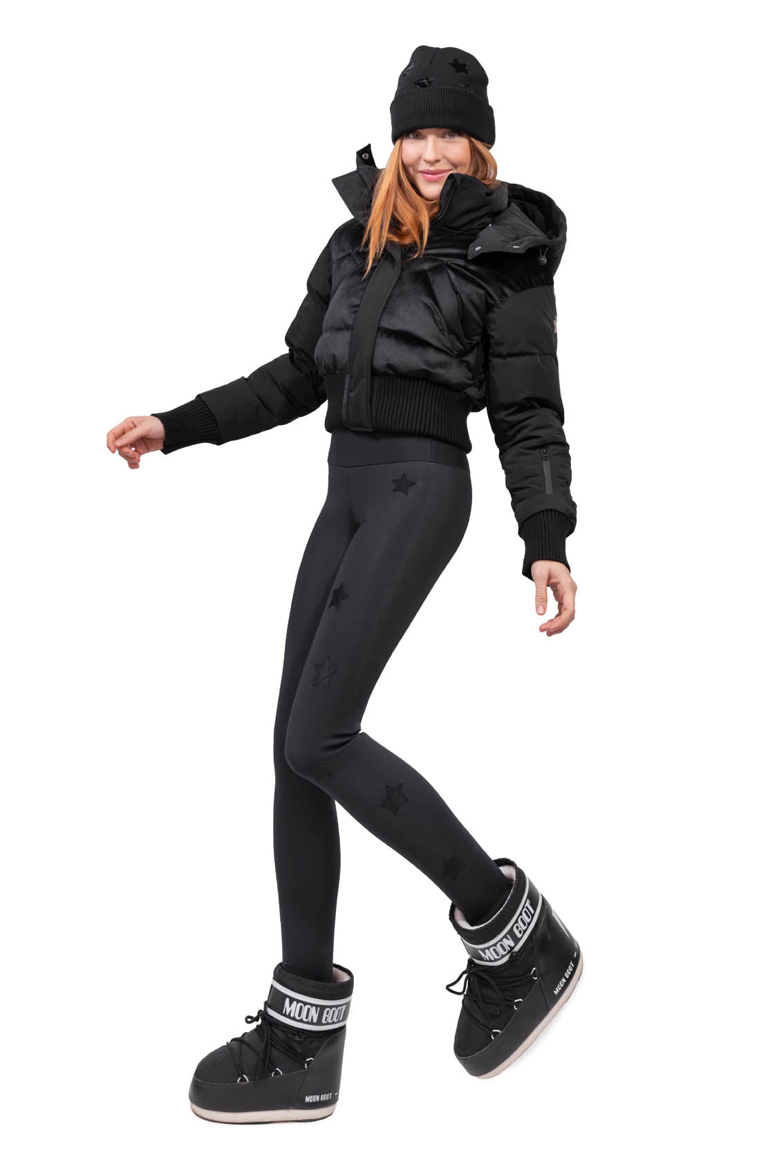 Un piumino corto e avvolgente, pensato per brillare sulle piste e nei tuoi momenti di montagna. Realizzato in Italia in un pregiato tessuto tecnico idrorepellente, unisce calore, femminilità ed estetica fashion-first, con l’immancabile tocco iconico delle stelle applicate a mano.