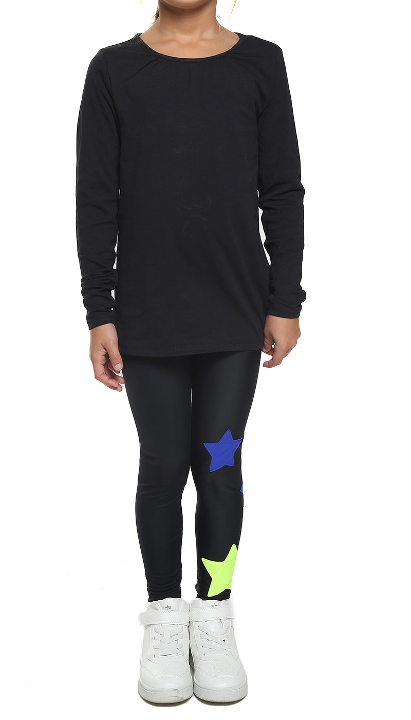 Leggings Bambina in lycra neri con stelle applicate blu elettriche e gialle fluo