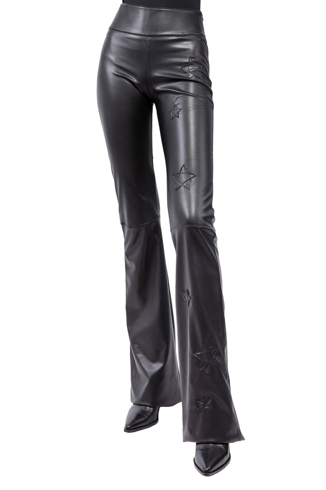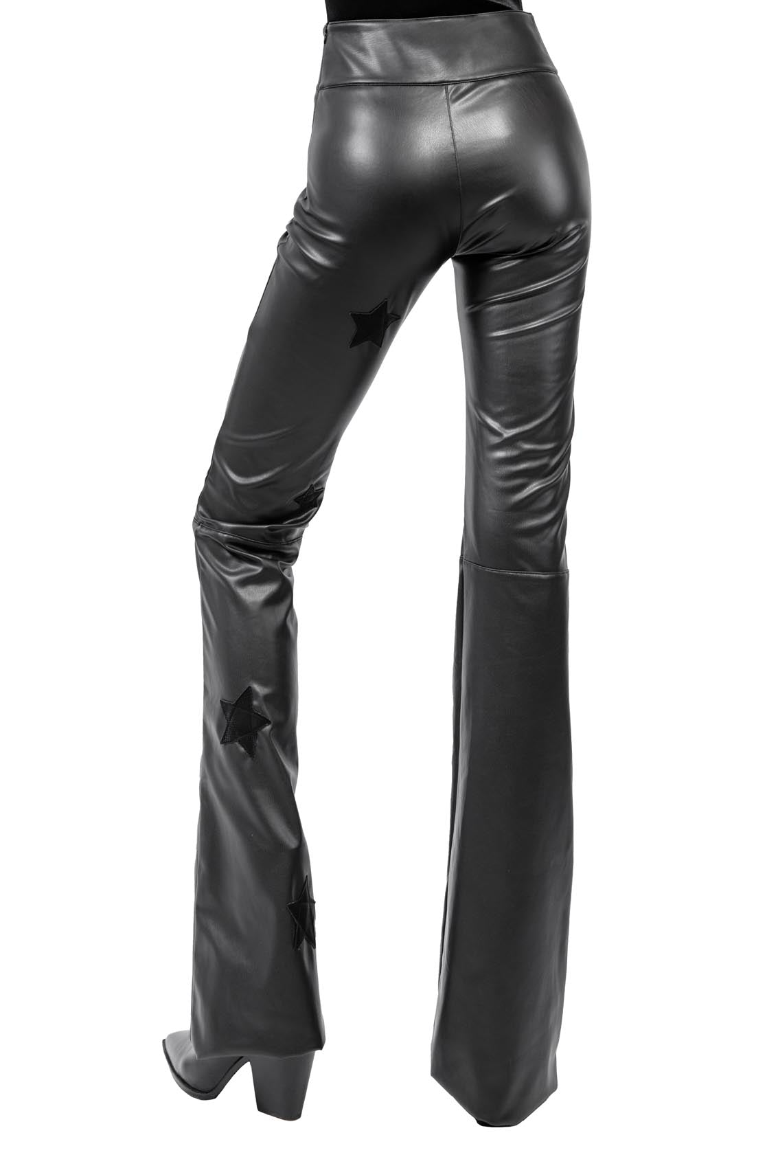 Pantalone in ecopelle elasticizzata nera, dal finish lucido ed elegante. La vestibilità aderente valorizza la silhouette, mentre le stelle applicate tono su tono donano carattere e unicità al capo. Perfetti per look da sera o outfit grintosi, da abbinare sia a top eleganti che a maglie oversize per uno stile più casual-chic.
