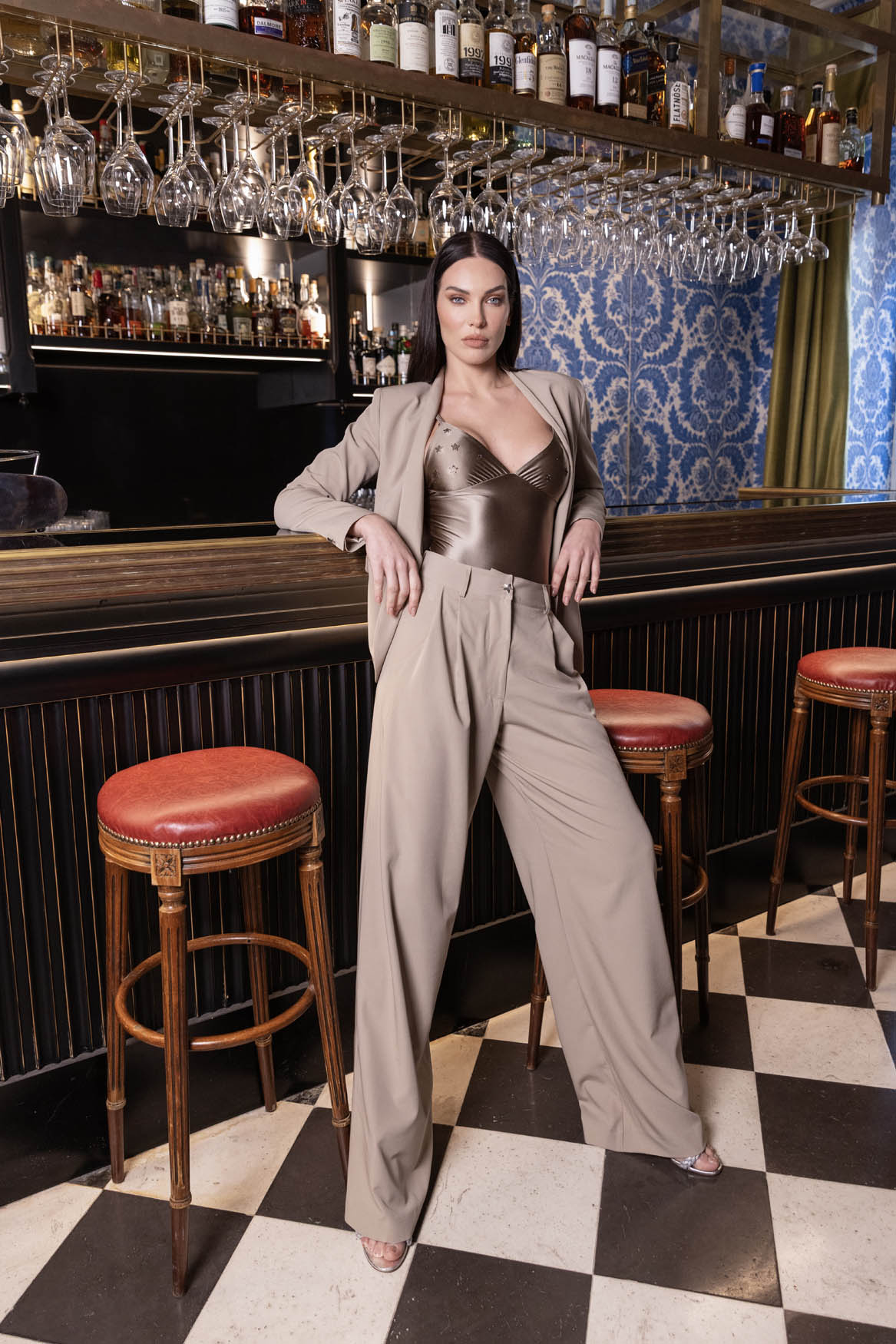A soft trouser with a masculine style reinterpreted for women, with structured yet feminine lines, combining elegance and comfort, creating an androgynous and sophisticated look.