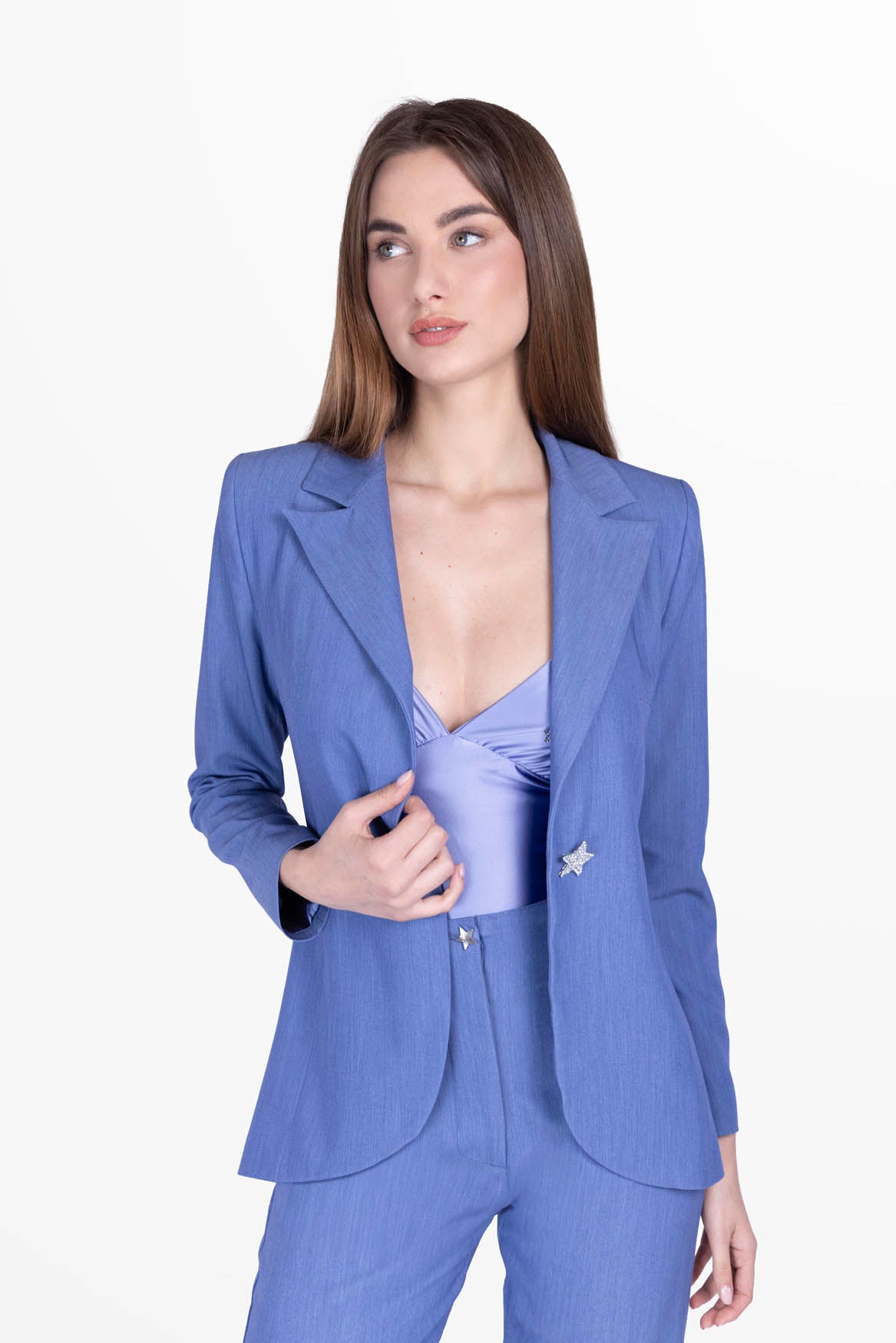 Women's blazer with a minimalist and modern design, satin collar, precious artisan star-shaped button.