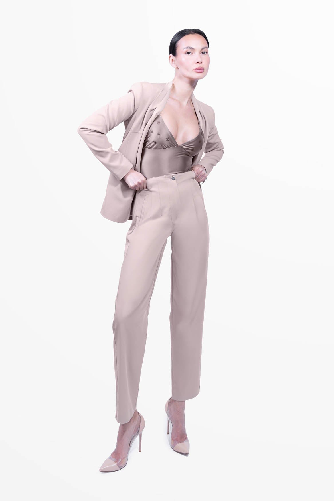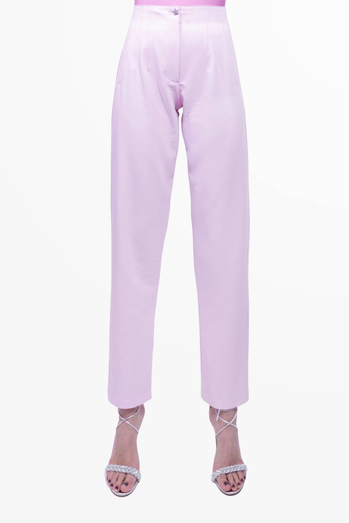 Made in a fluid yet structured fabric, these trousers feature a sculpted high waist with delicate front pleats and an invisible closure finished with our iconic applied star. The leg is soft, slightly tapered, perfect to pair with both a silk shirt and a bolder top.