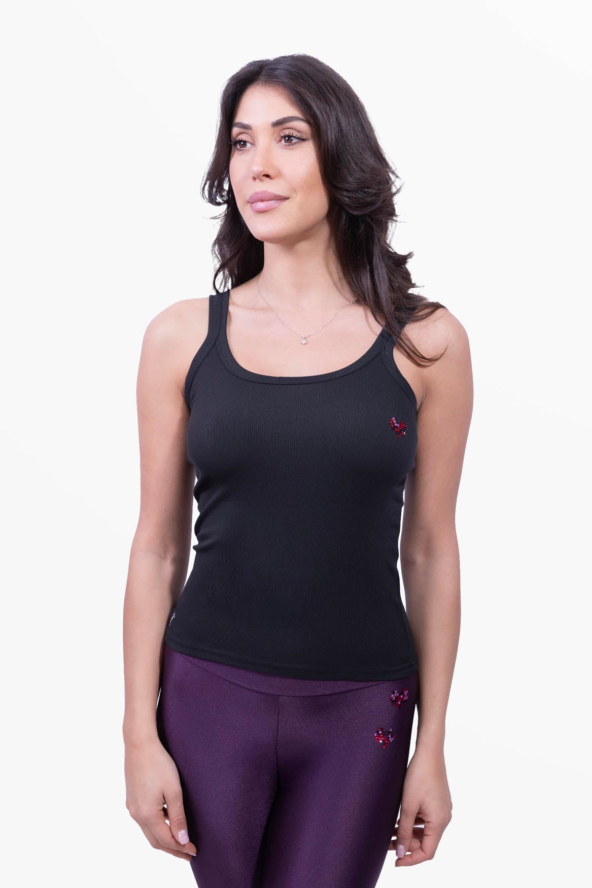 The tank top is enhanced by a hand-applied multicolour crystal heart on the front, discreet yet luminous, serving as the signature detail of the Amoureuse line.